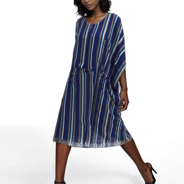 Step into effortless elegance with this Hand-Woven Poncho Dress, a perfect blend of comfort and bohemian charm. Featuring intricate woven stripes in rich shades of blue, brown, and tan, this statement piece adds instant style to any occasion.