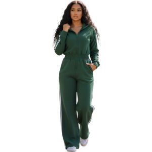 Designed with signature side stripes, this jumpsuit delivers a sleek, elongating look perfect for lounging, travel, or streetwear fashion. The soft stretch fabric ensures all-day comfort, while the hooded top adds an effortlessly cool vibe.
